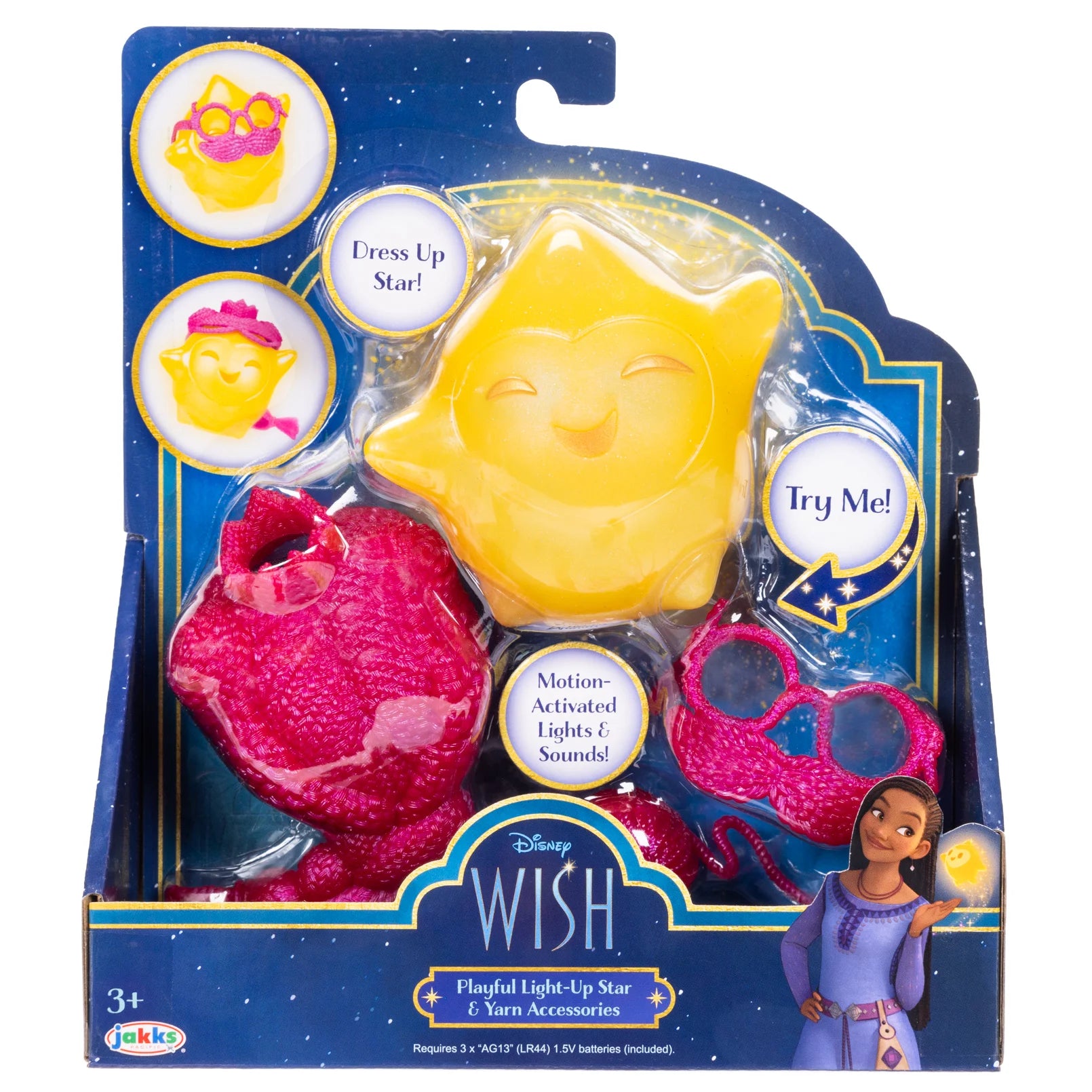 - Product Description: It's a toy inspired by Disney's animated film Wish, featuring a light-up Star figure with motion-activated lights and sounds, and yarn accessories for dress-up play.